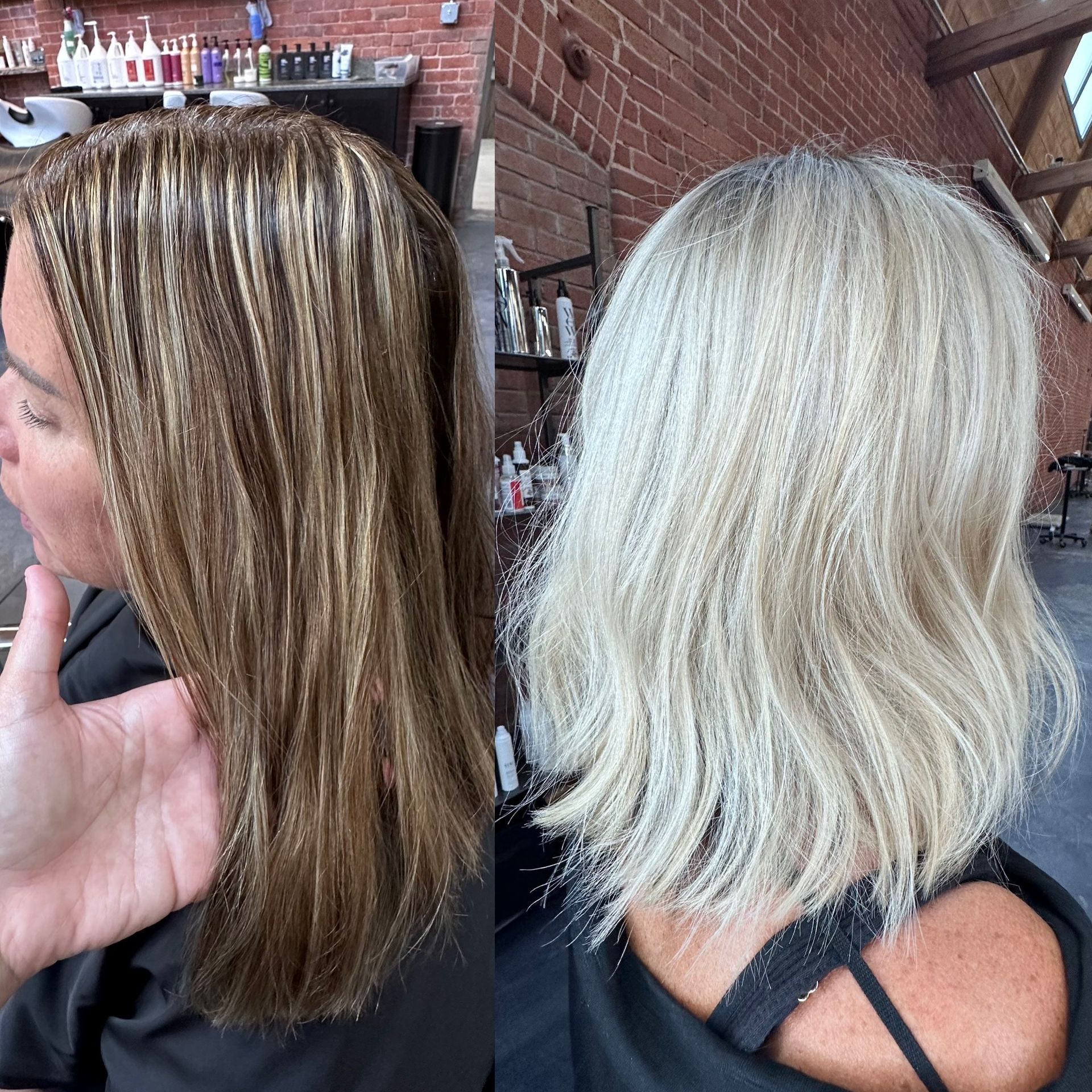 She eventually wants to be a copper-gold, but I focused on lightening her dark base first before going that blonde. Sometimes, you need to lift the background over a few sessions to get the best result!